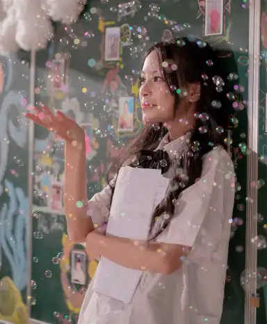 — Chuyển động nhẹ: tóc bay, lớp vải mềm, hơi thở mùa đông tạo cảm giác mong manh.